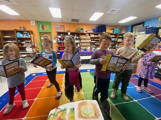 First graders practice their reading skills as they participate in a reader's theater activity. Learning skills while having fun!