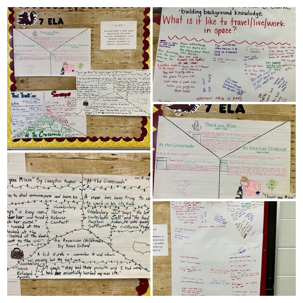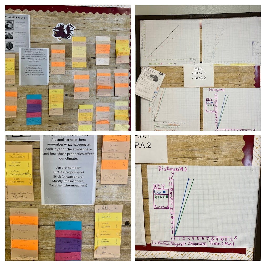 Spotlighting authentic evidence of learning in our school hallways — student work from upper elementary and middle school that demonstrates creative and critical thinking across subjects. These displays are not just decorations: they are classroom products show how learners apply concepts, communicate understanding, and engage in higher‑order thinking. |