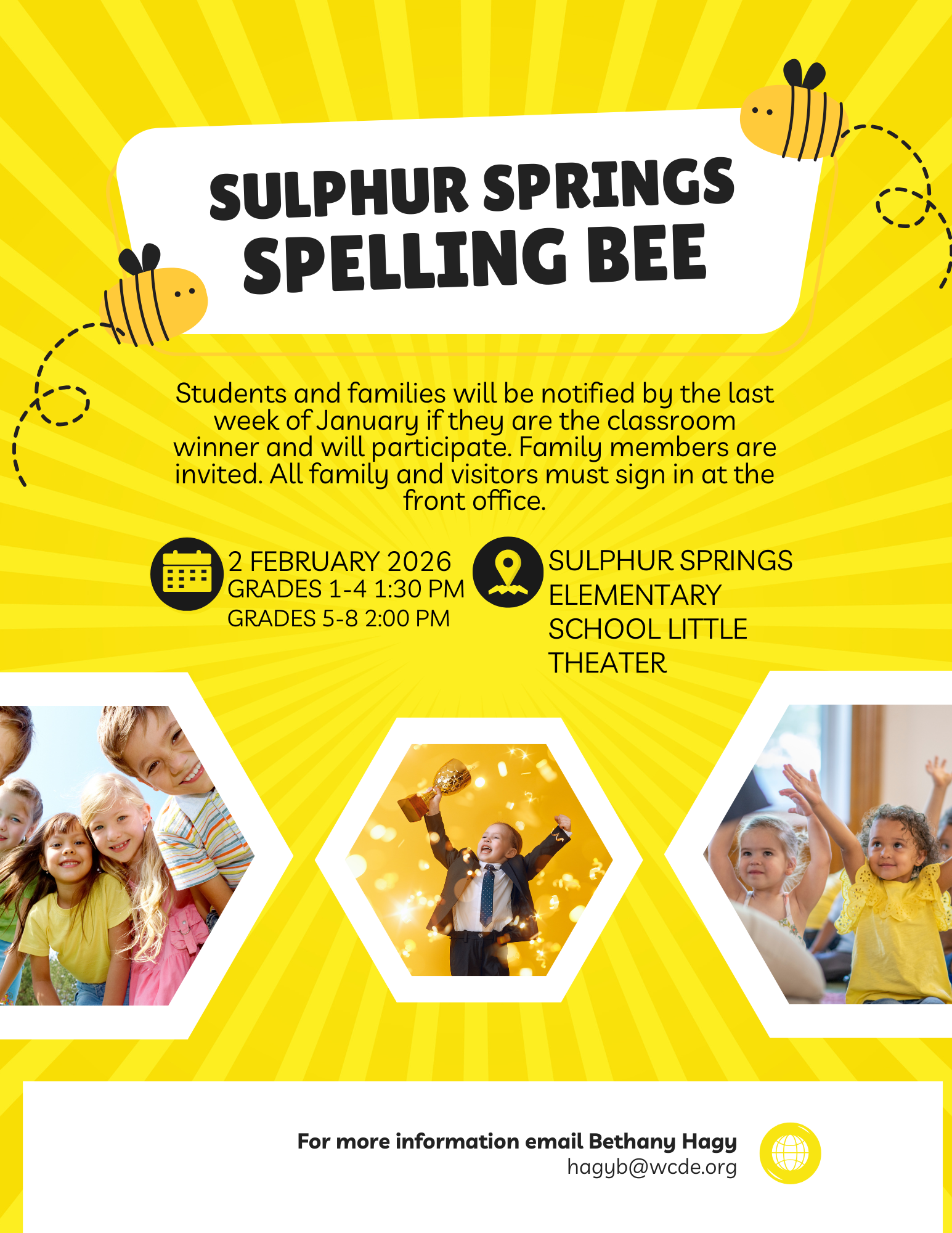 - February 2: Sulphur Springs Spelling Bee grades 1-4: 1:30 pm, Grades 5-8 2 pm